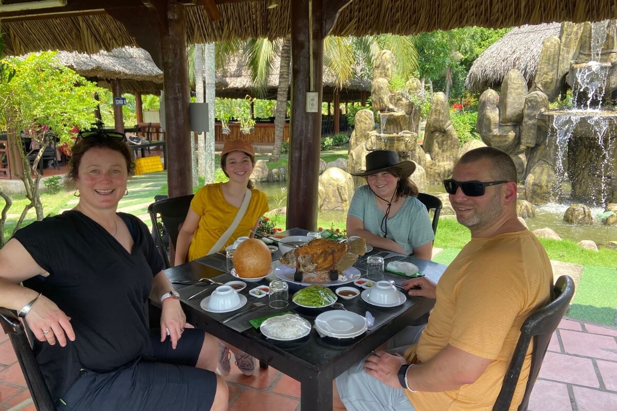 In the afternoon, you will cruise along the Ham Luong River, visiting small factories that provide an insight into how the local economy works. Stops include a coconut processing workshop where you can sample fresh coconut and see how every single part of this versatile nut is turned into food and other products, and a broom-making family, where brooms are made using coconut leaves – you can even have a go at weaving yourself!